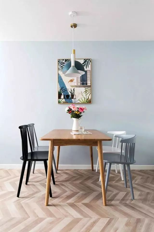 淡蓝色的墙面背景基础,木质餐桌搭配黑白灰餐椅,背景墙上再挂一幅植物装饰画,还有双拼文艺吊灯,整个空间都显得充满了雅致的情趣感。