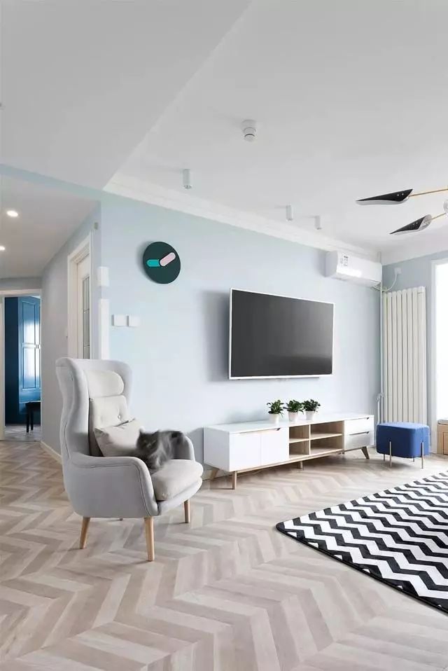 电视墙白色的成电视柜,左侧是一个创意有趣的时钟、右侧这是一个壁挂空调,整个电视墙简洁清新文艺的设计,令人轻松自然。