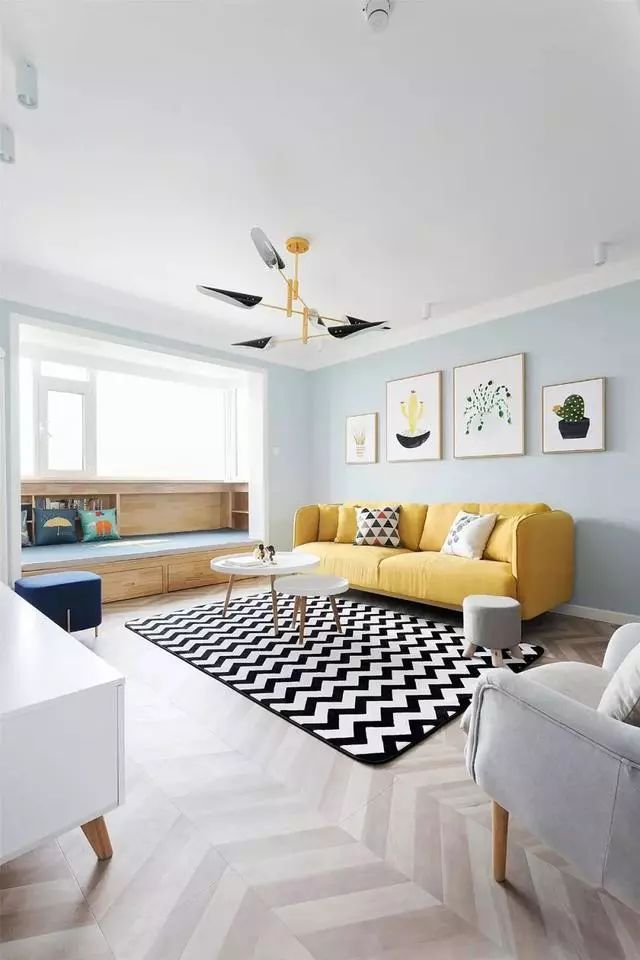沙发墙挂上四幅精致简洁的装饰画,搭配黄色布艺沙发与黑白波纹地毯,还有双拼圆形小茶几,整个空间充满了舒适的活力,休闲区木质定制的榻榻米,坐在这里晒晒太阳、看书放松过日子,轻松惬意。