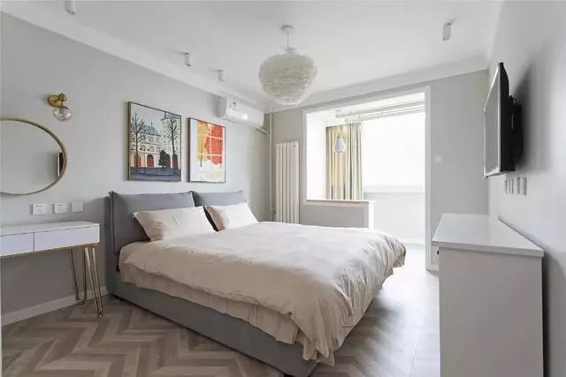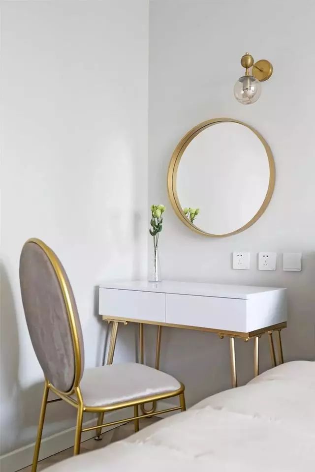 床头左侧是金属架的梳妆台,圆形镜子上方一个小灯泡壁灯,彰显着主人典雅的气质感。