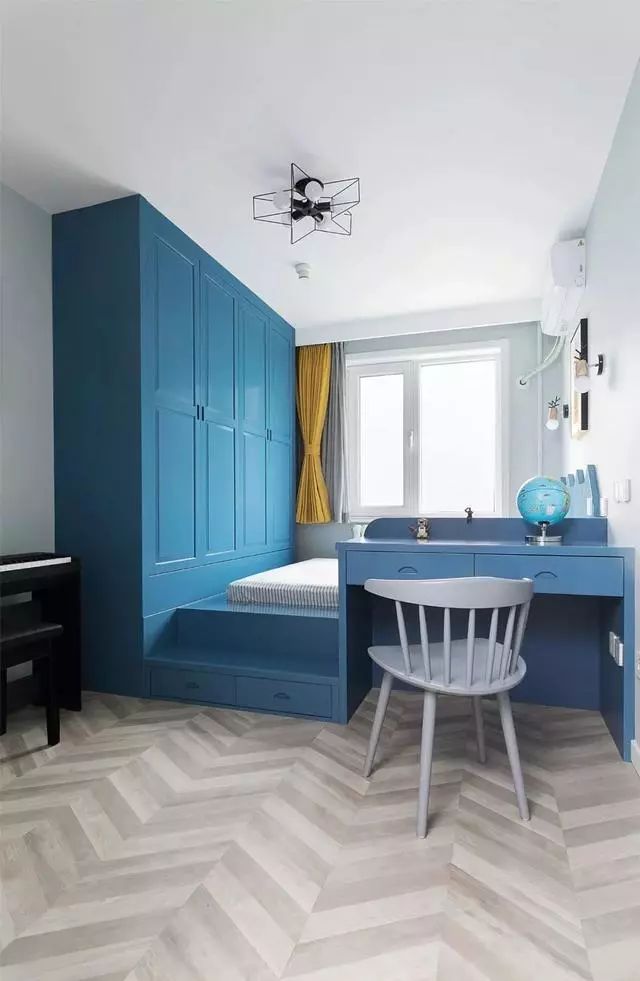 儿童房整体以蓝色定制的衣柜与床体,在床与活动区之间装了一个书桌,这样巧妙的格局设计,使得小空间也更加宽敞大气。