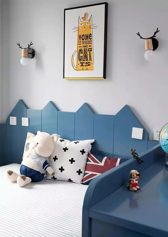 床侧边的床头墙以屋顶状的护墙板,中间挂画+两侧鹿形壁灯的设计,使得空间充满了童趣感。