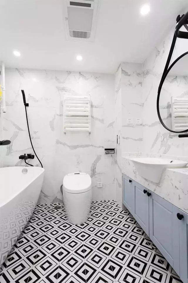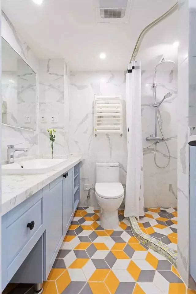 公卫地面是立体感的六边砖,以马赛克+浴帘干湿分离隔断,卫浴空间显得充满了活泼的氛围感。