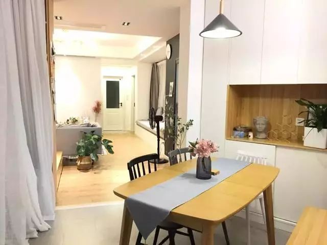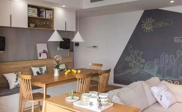 小户型通常会选择做定制的餐边柜,然后把地柜和吊柜给连载一起,中间留空一部分用来摆放常用的物品,整体感非常强。