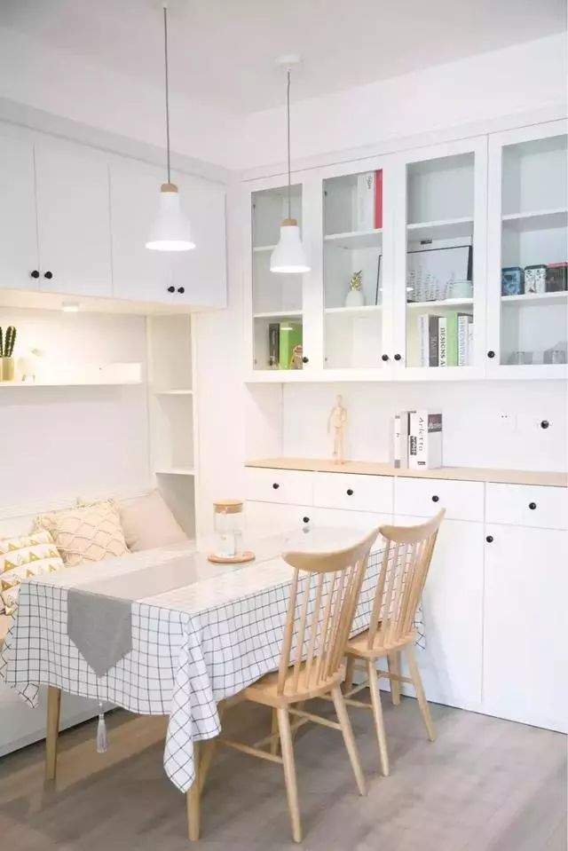 很多小户型的屋主都会选择卡座式的餐厅,那么除了卡座本身的收纳外,卡座上方的墙面就可以用来加上吊柜,避免东西没地方放。