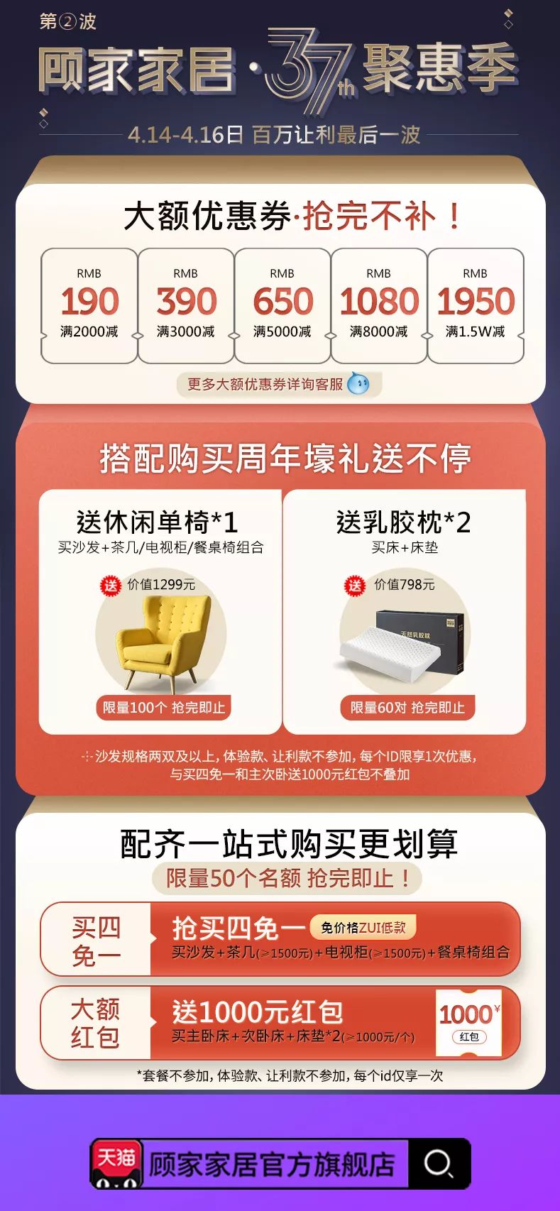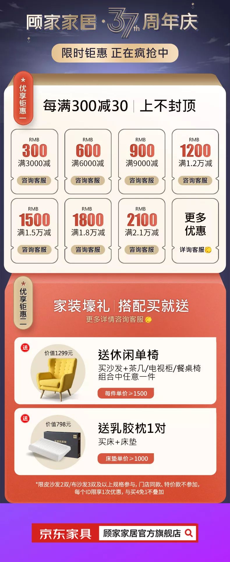 顾家家居37周年聚惠季 “37”提起 “37” 你会想到什么?emmmmm,人类的正常体温是37℃3.7是属于万千小姐姐的女生节...其实“37” 对于顾家家居来说是一个普通却值得记录的数字回想起37年前顾家家居的第一代创业人在江苏南通创建【顾家工坊】传承自天台的手工技艺,积累沙发制作工艺今年,是