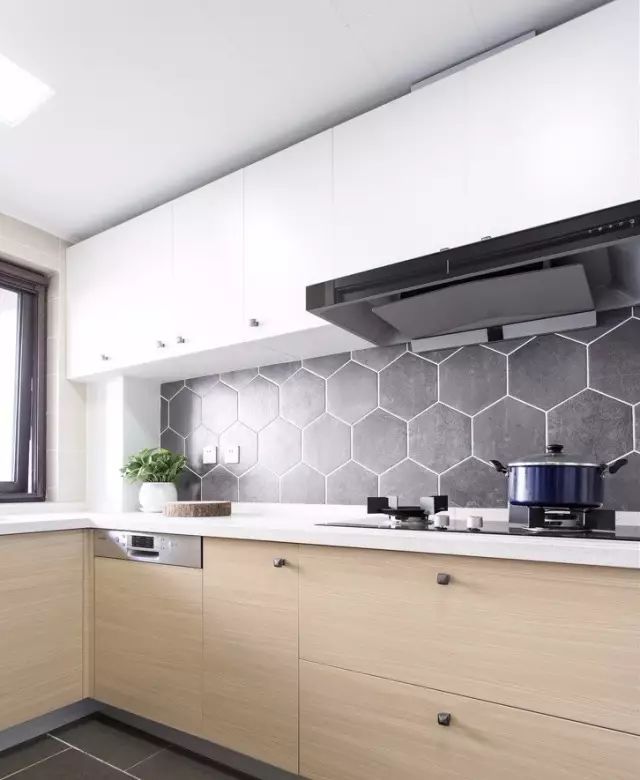 ▲长排吊柜的储物空间超大,蜂巢型瓷砖具有前卫的现代感。