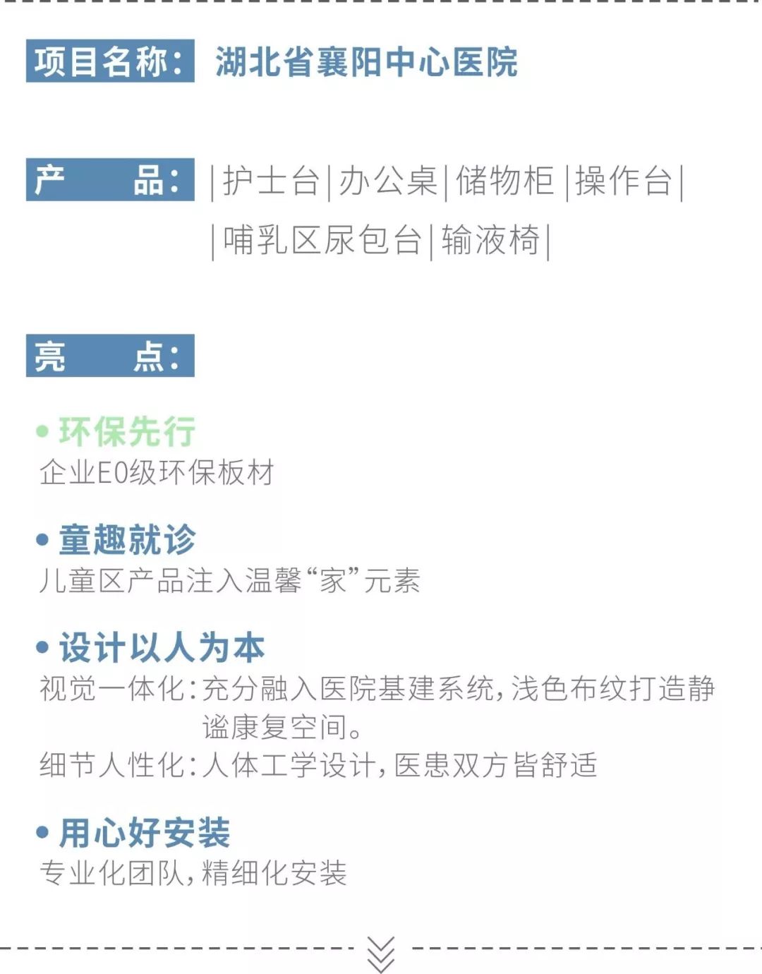 医院,是抵抗力低下的易感人群聚集的公众场所,需更注重产品的绿色环保。襄阳中心医院项目所有产品均选用企业E0级环保板材,并成功通过襄阳中心医院项目部的环保检测验收。