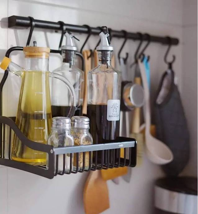 挂钩式厨房收纳篮搭配一条壁挂杆,挂在墙上的调料盒就出现了,多几个S型挂钩,厨具也可以挂上去!