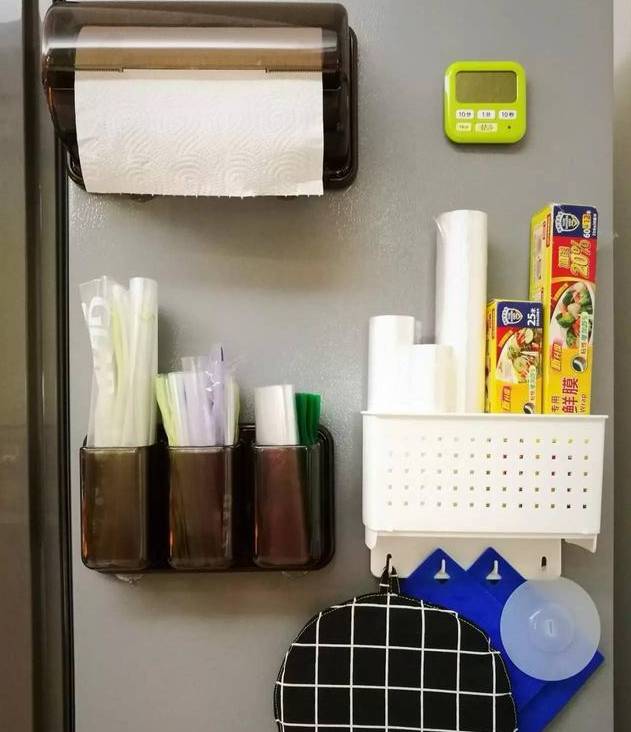 大部分业主家里的冰箱应该是放在厨房的,冰箱上的吸铁收纳盒,也是小户型的收纳神器之一,把保鲜膜、保鲜袋都挂在冰箱上,就可以省下一点空间了。
