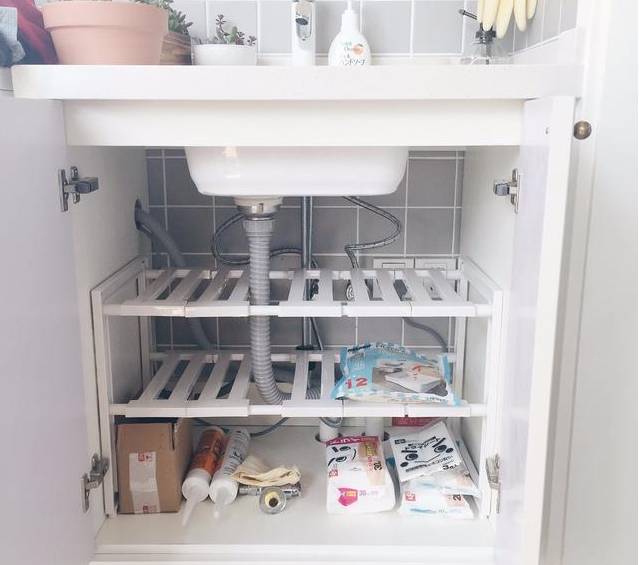 还有这款伸缩收纳架,避免了水槽下方的管道问题,也可以用在厨房水槽下面,用来放清洁用品是再好不过了。
