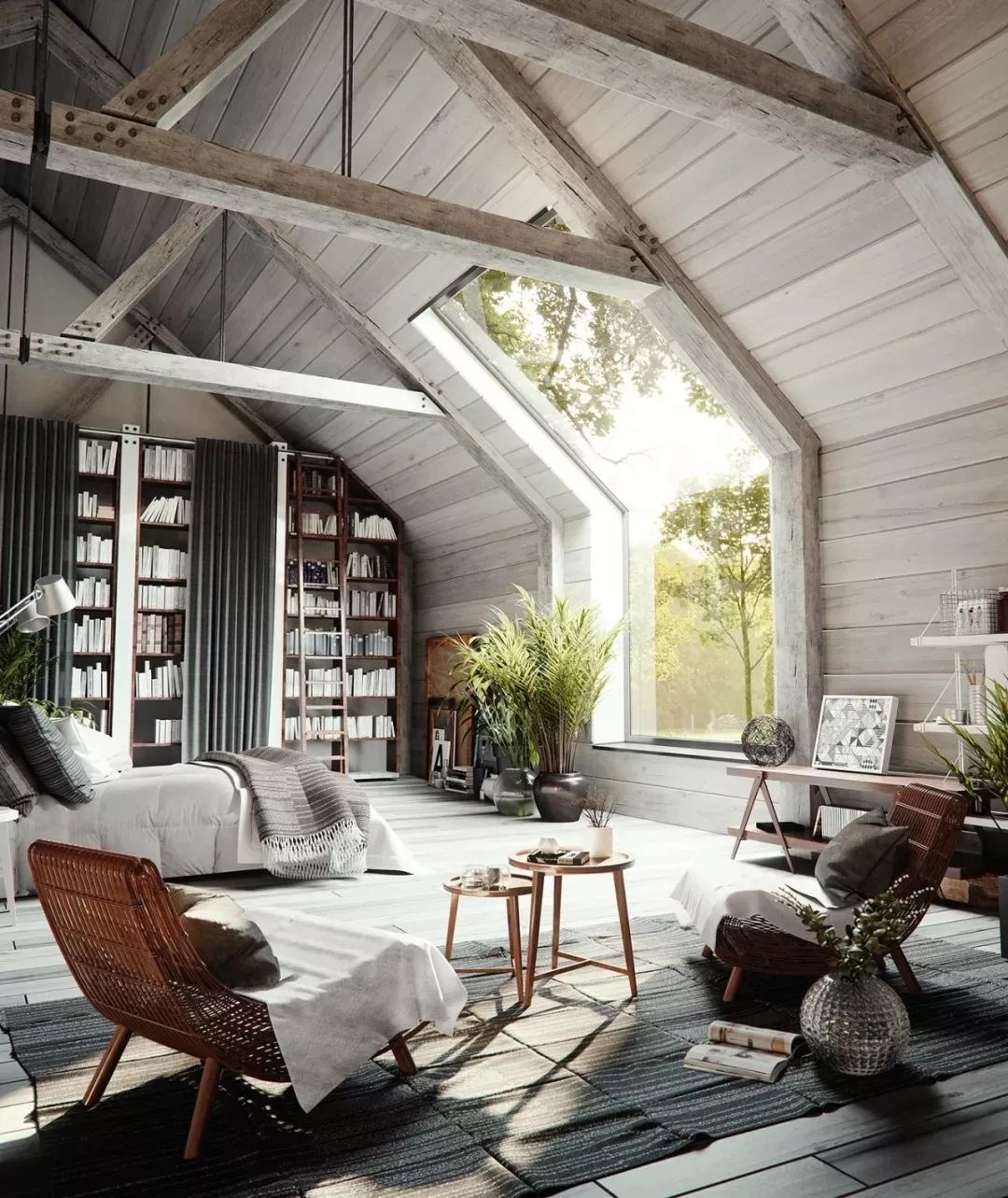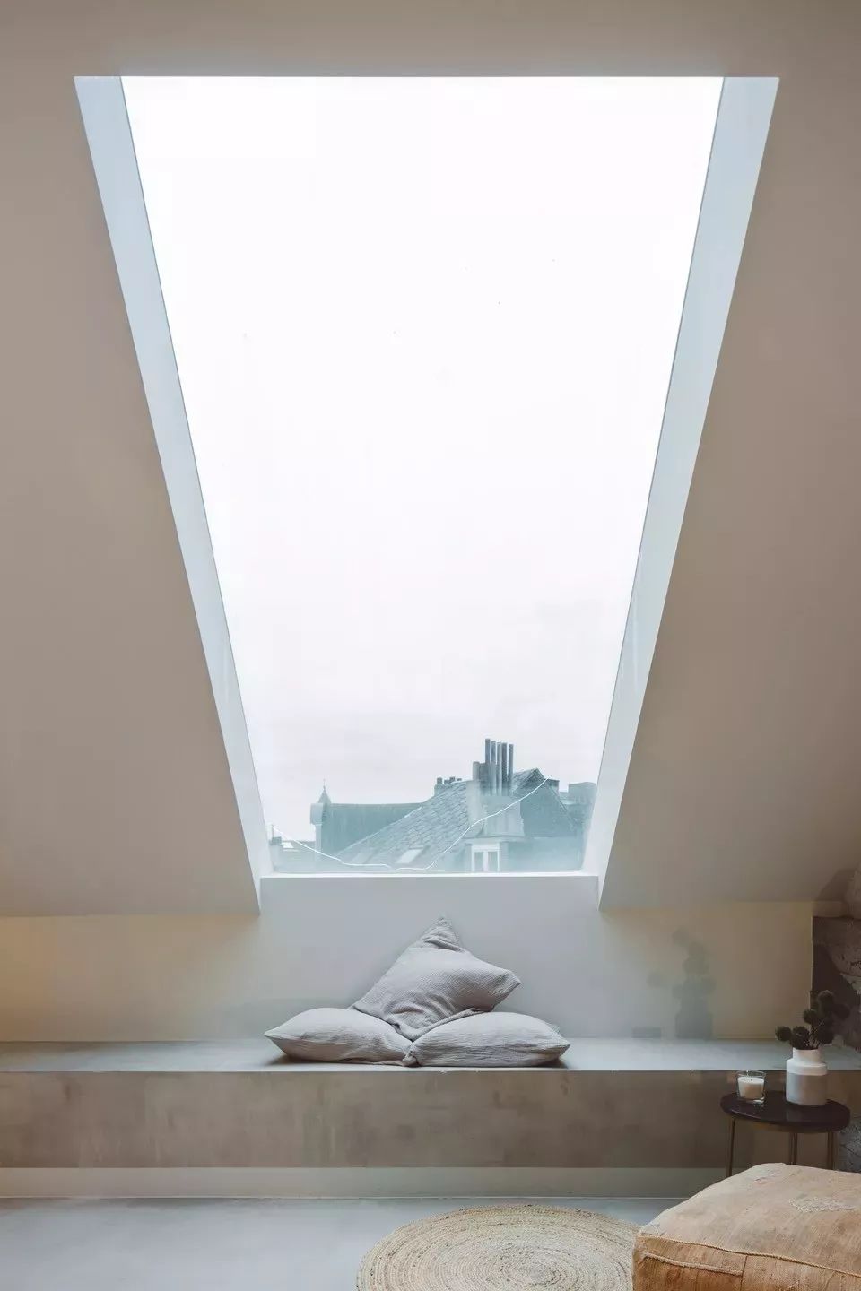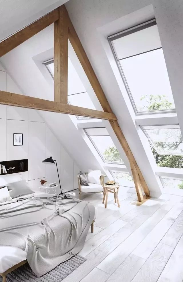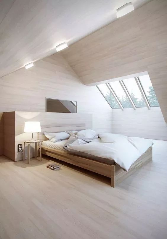 在将阁楼设计成卧室时,利用好阁楼窗户是空间布局的关键,充分利用阁楼的窗户采光,让整个卧室开放明亮。