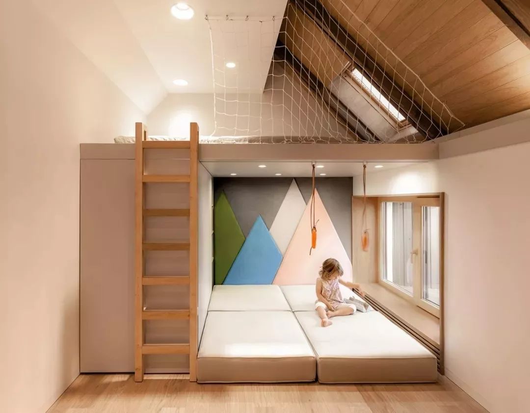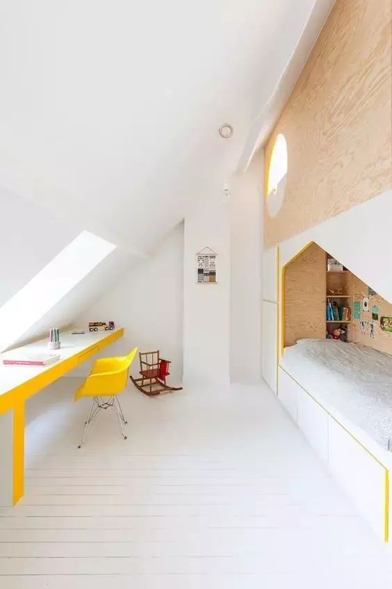 阁楼本身的空间比较低矮,且有不规则的特点,但是些缺点在儿童房的装修中,恰恰成了个性的所在;不规则创造了儿童房的童趣个性,大大提升孩子的好奇心。