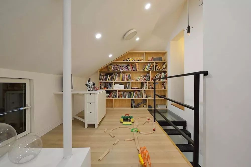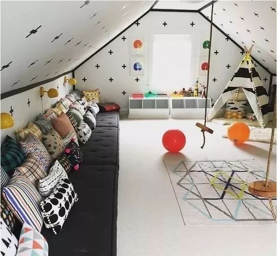 阁楼打造的儿童空间,尽量保证窗户足够大,光线充足;孩子在里面才能接受阳光的照射,另外最好铺设软木地板,这样比会降低孩子摔伤的几率。