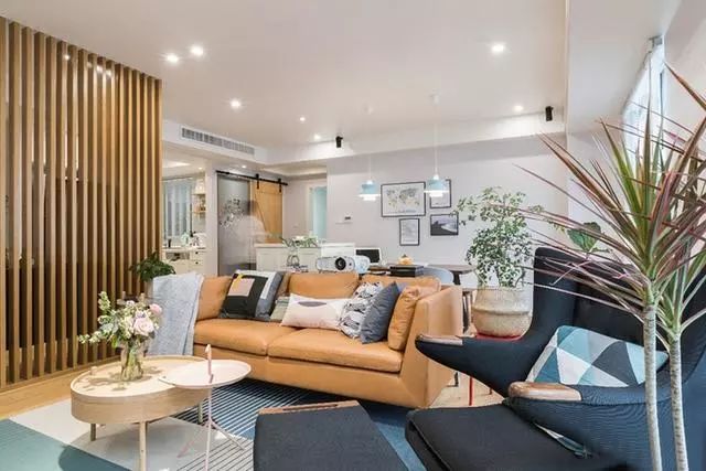 关注微信公众号:jia-xd,学习大户型装修知识和技巧!下面我们再来看一套128平北欧三居室,设计师很好的将现代风格和北欧风格 相融合,使得整个居所既具有现代时尚感,同时还非常的简约、舒适,尤其是一个大大的U型厨房好看又实用!下面一起来感受一下吧!为了避免开门正对客厅的尴尬,这里使用了木质栏栅进行