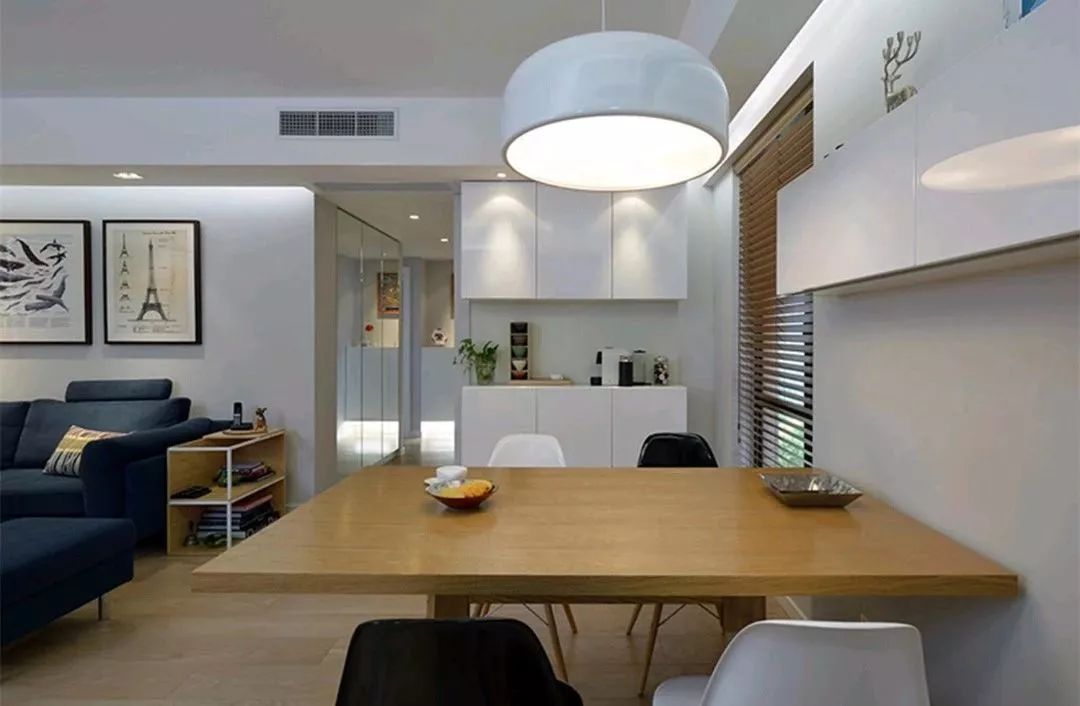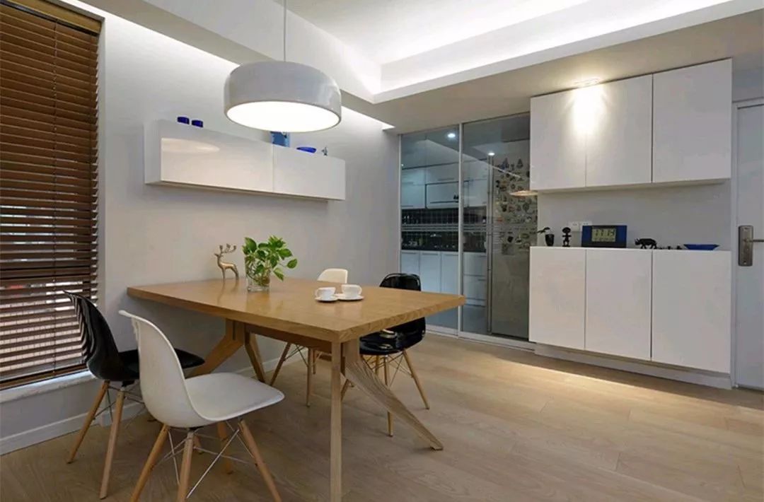 客厅另一侧的餐厅空间没有做太多的装饰,原木风的餐桌椅上方做个白色吊柜,加上简洁款的吊灯,整个餐厅边的墙面都做了柜子,满足收纳的需求。