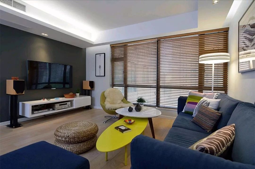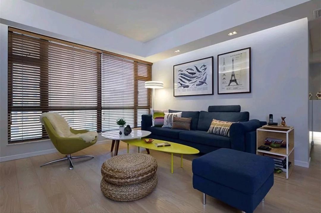 客厅的空间其实不大,但是通过蓝色的布艺沙发、脚凳,搭配灰色的墙面、木色窗帘等,各种不同的色彩组合起来,让客厅更有层次感。
