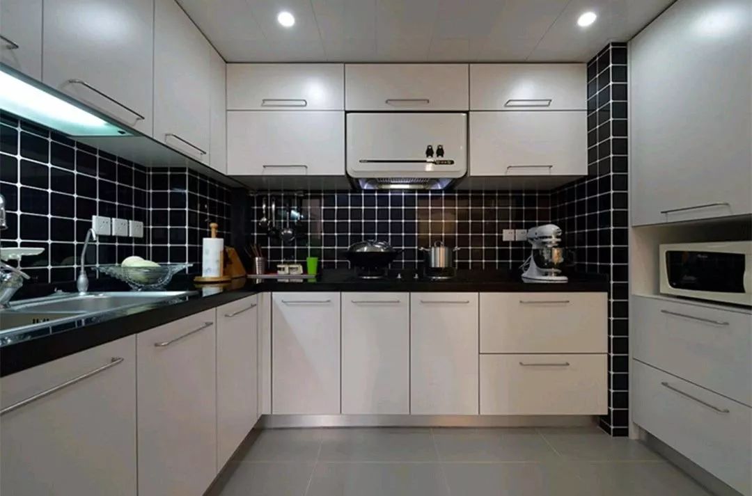 厨房内部的空间较为宽敞,选择了经典的黑白灰配色,用白色的柜子来缓解黑色墙体的压抑感,结合灰色的地砖,简单而又舒适。