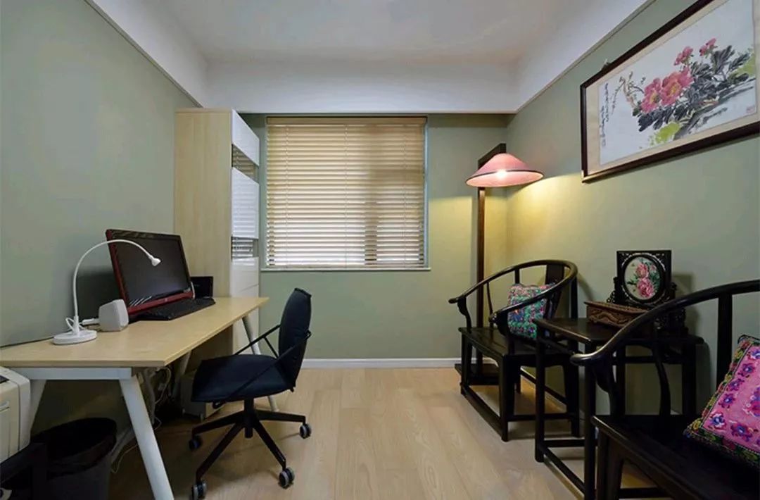 书房同样以绿色为主,搭配中式风的休闲桌椅和装饰画,让小清新的书房内,多出了复古范,更有书香气息。