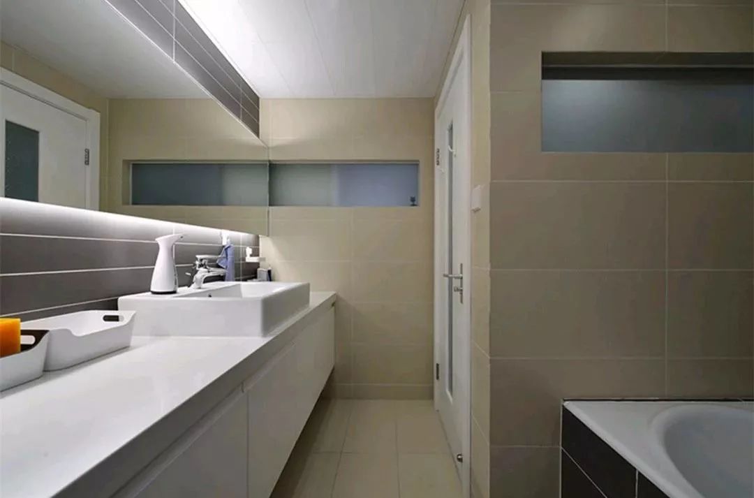 卫生间内用整面墙来打造一个长镜柜,再加上藏光的设计,让卫生间看起来宽敞了许多,镜柜比起正常的镜子,也能多出更多的储物空间。