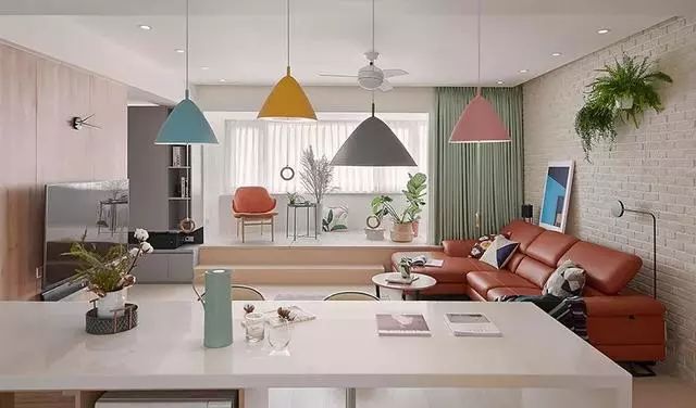 软件辅以橘红色沙发、嫩绿落地布帘、绿意植栽,让空气感调性之下多了几分活力。