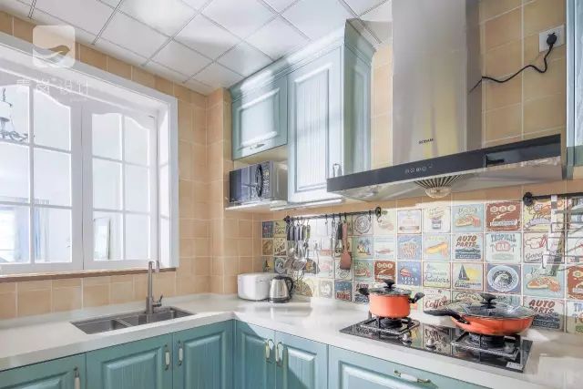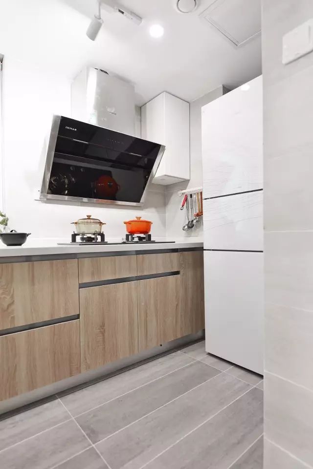 另外,为使厨房风格统一,有些业主很喜欢在顶吸式抽油烟机外部做吊柜将其包起来。就像这样↓