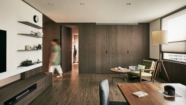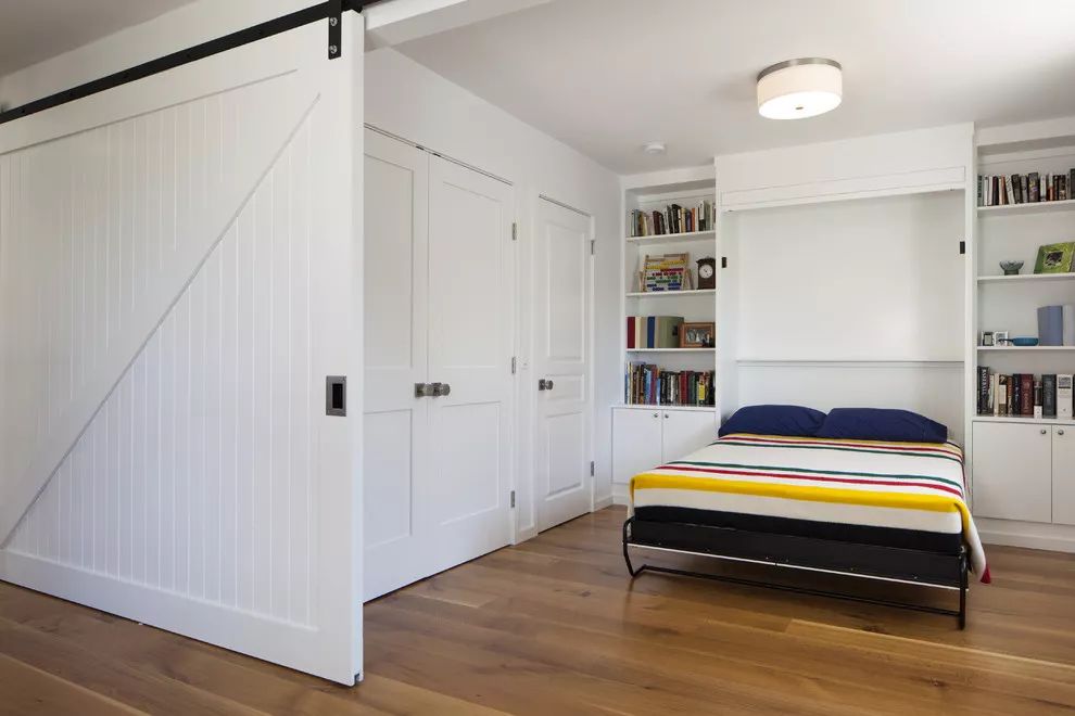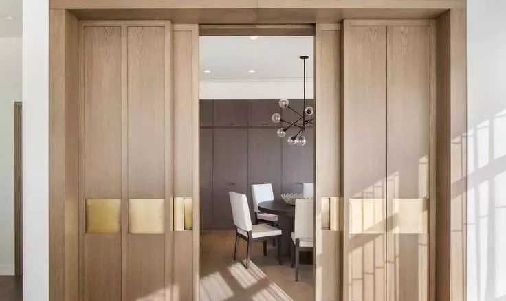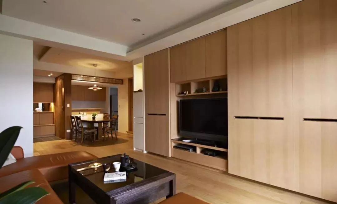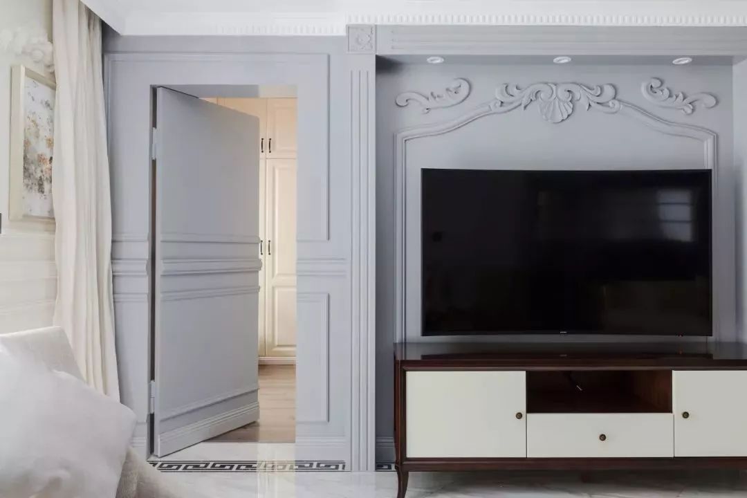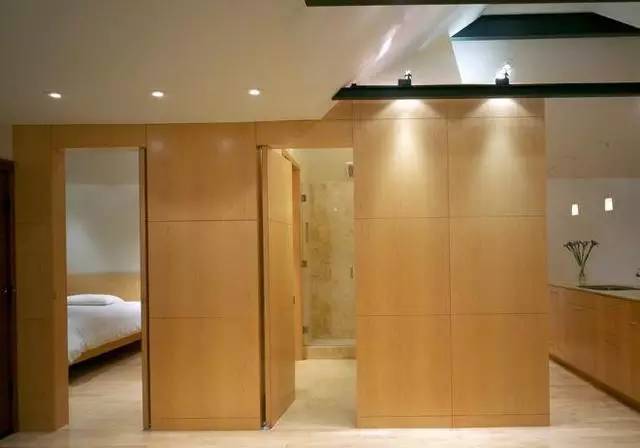 可以在家里通顶的大柜子中,做一扇门隐藏其中。比如下面客厅一整面的通顶大柜子中,藏着一扇通往卧室或者卫生间的门。