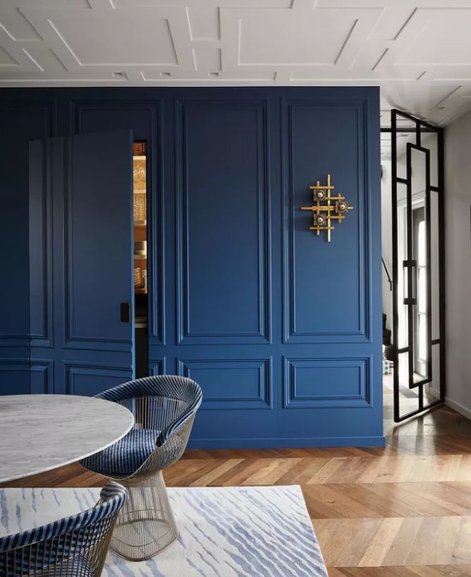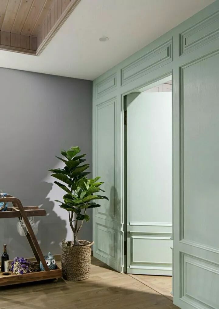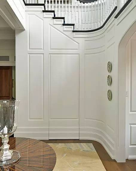 用来护墙的饰面板,同样可以巧妙地安在门上。你可以在装护墙板时,顺便做一个隐形门,但不建议为了隐形门而装上一整面墙的护墙板,费用真的承担不起呀。