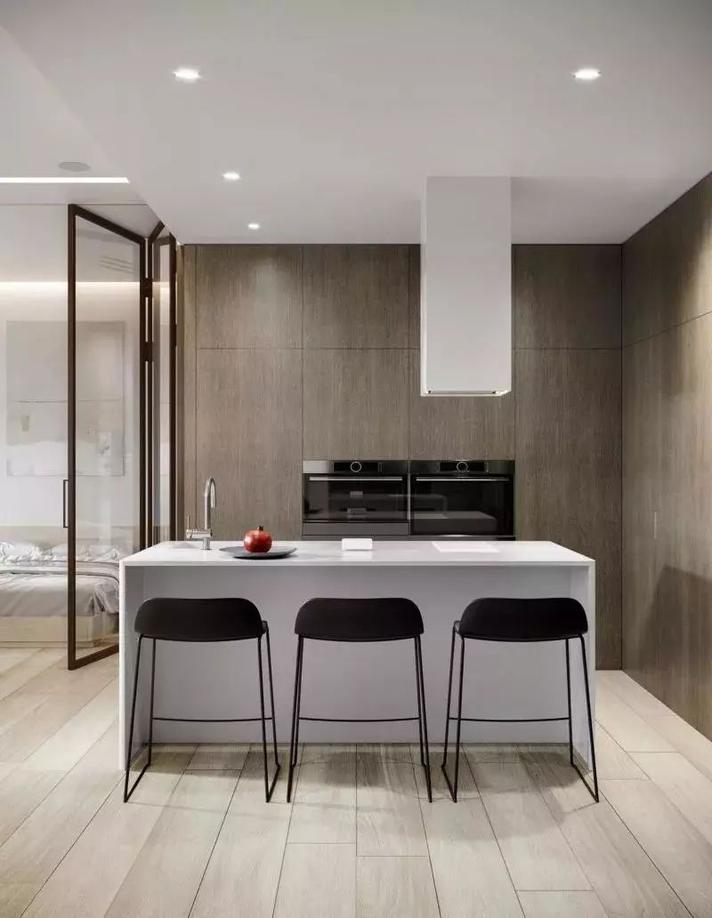 在沙发的背后是卧室空间,客厅和卧室之间用玻璃折叠门作为隔断,这样可以保证光线的流通,又能避免油烟的问题,折叠门所占据的面积也比较少。