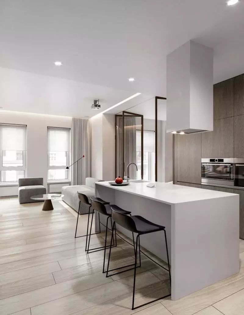 开放式的厨房和餐厅结合在一起,岛台也成为了餐桌,在岛台底部摆放餐椅。两侧的柜子围绕着岛台,一些厨房电器也被嵌入了柜子当中。