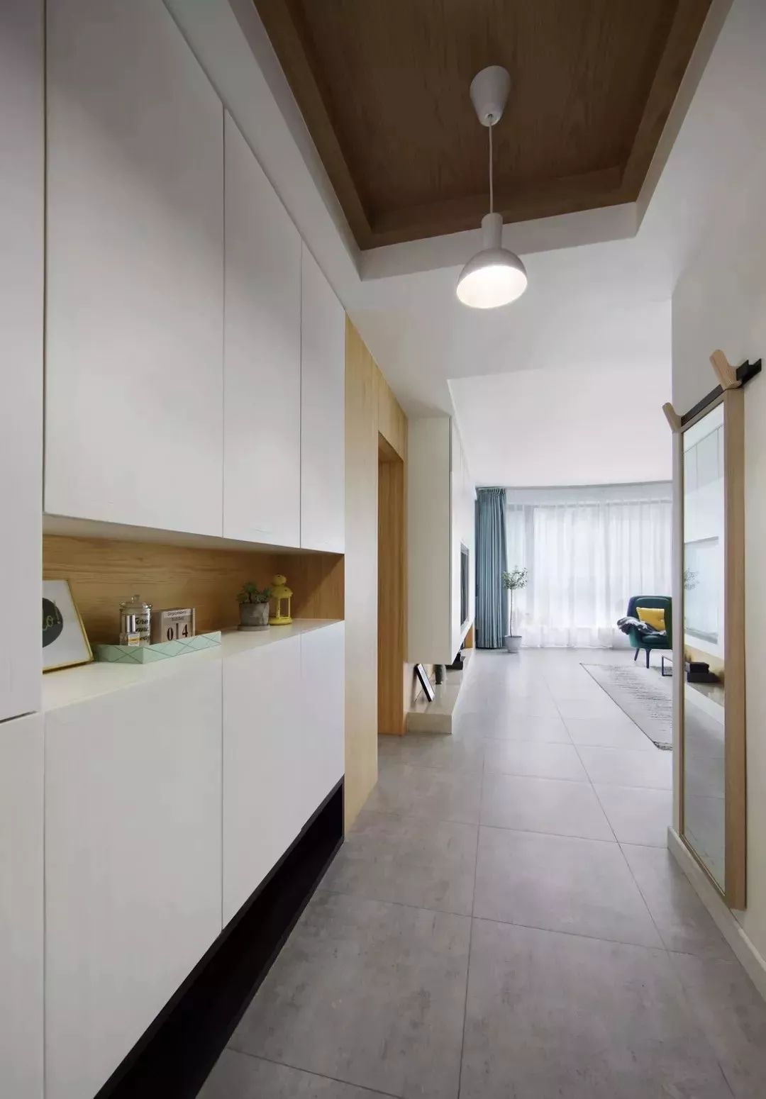 入户玄关设计,左边是一个定制的玄关柜,柜门隐形把手设计,整体干净大方;右边设置全身镜,方便出门整理衣冠。