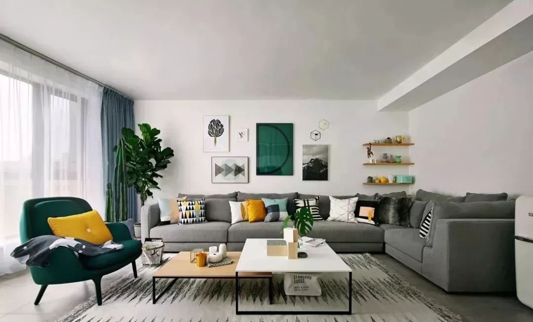 客厅的整体色调偏灰,加入女友最喜欢的时尚墨绿色软装搭配:墨绿扶手椅和主位挂画,相信女友一定会喜欢。