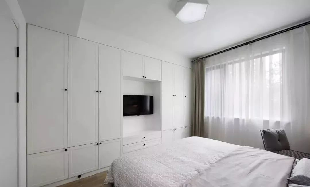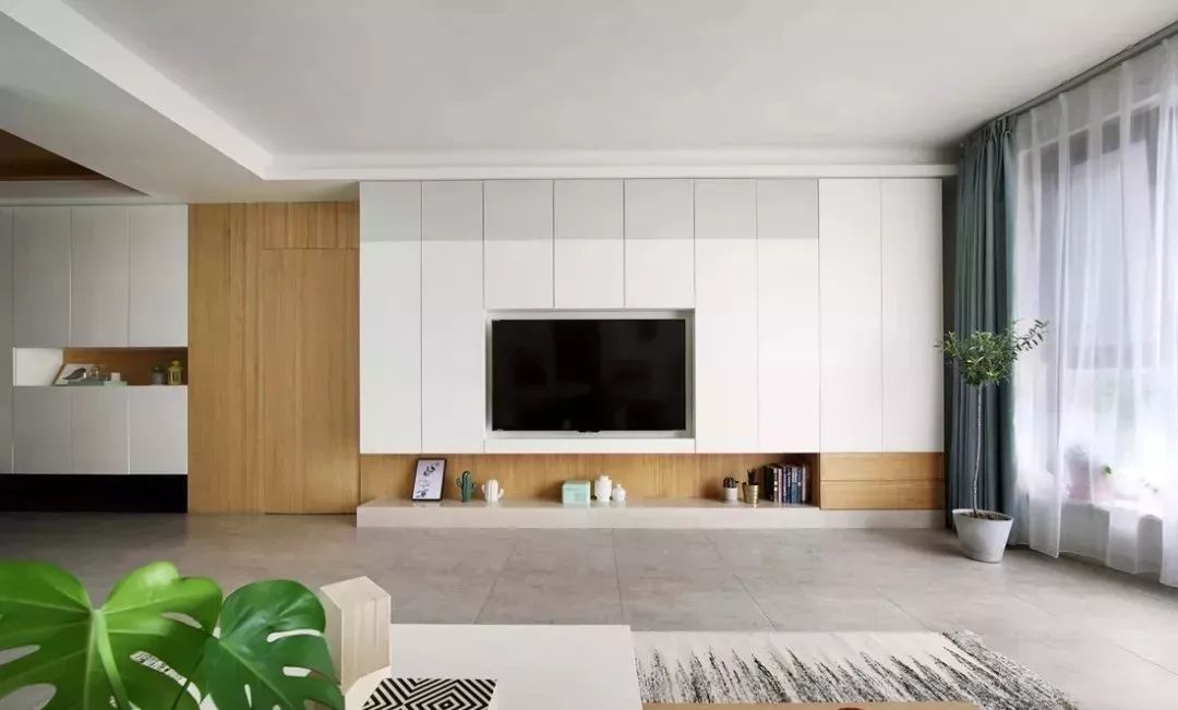 电视背景墙的柜子设计与玄关柜一致,同样是定制的,纯白色柜门搭配原木色,清新大方,也方便储物,小伙子说女朋友平时喜欢收纳,所有的设计都投其所好。