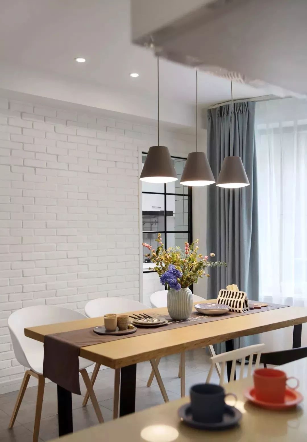 原木餐桌,放上清晨最新鲜的鲜花,摆好餐具和餐布,不忽视每一处设计细节。