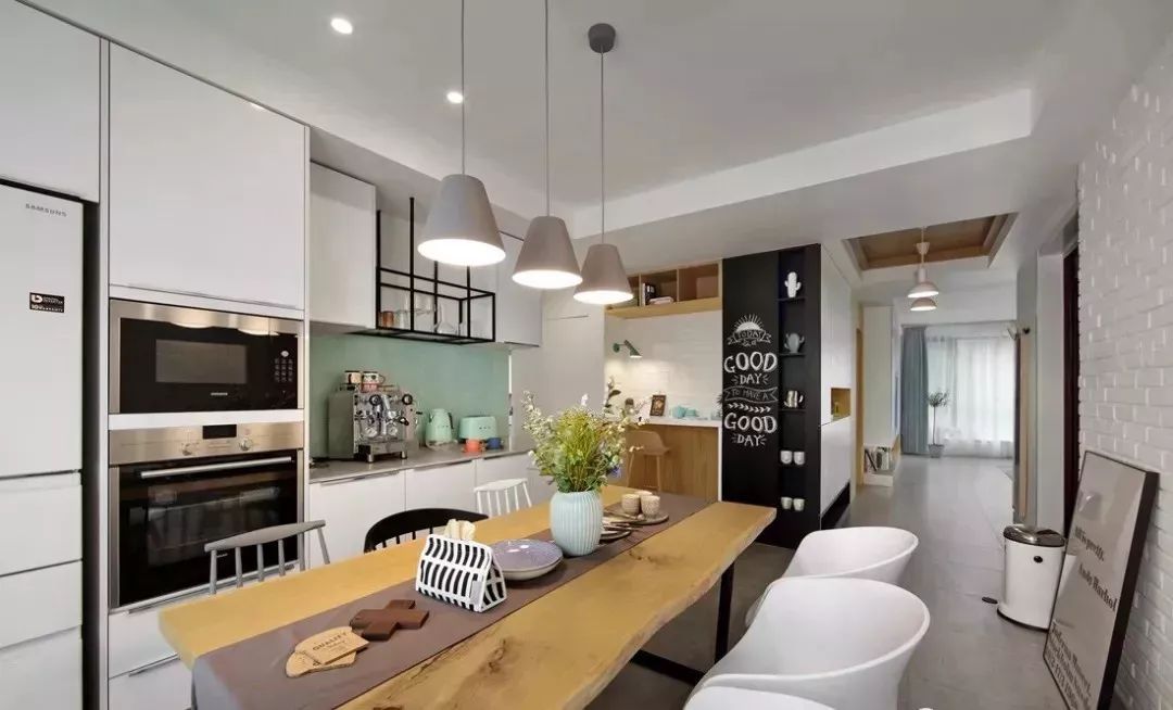 餐厅一边是刷漆的文化砖,一边则设计成西厨,当时设计的时候小伙子说女友喜欢烘焙和咖啡,喜欢西式餐厅,还特地买了咖啡机和烤箱,真的是太让人羡慕了。