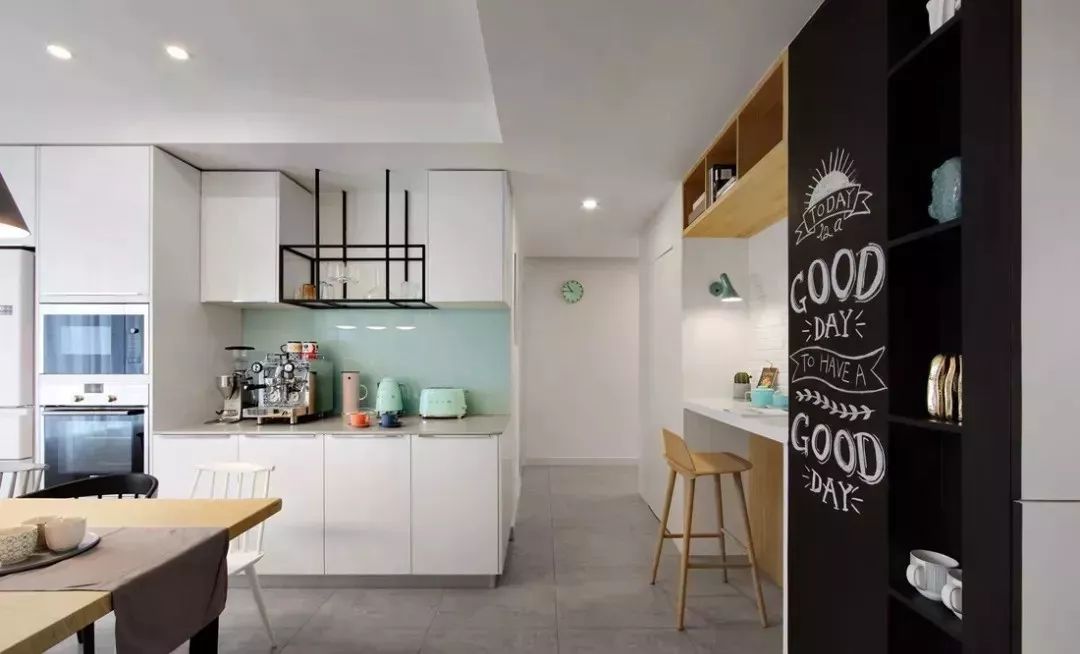 为了喝咖啡更有强调,在餐厅边上设计小吧台和黑板墙,黑板墙可以记录生活的点滴,想想以后的生活,肯定很美好。