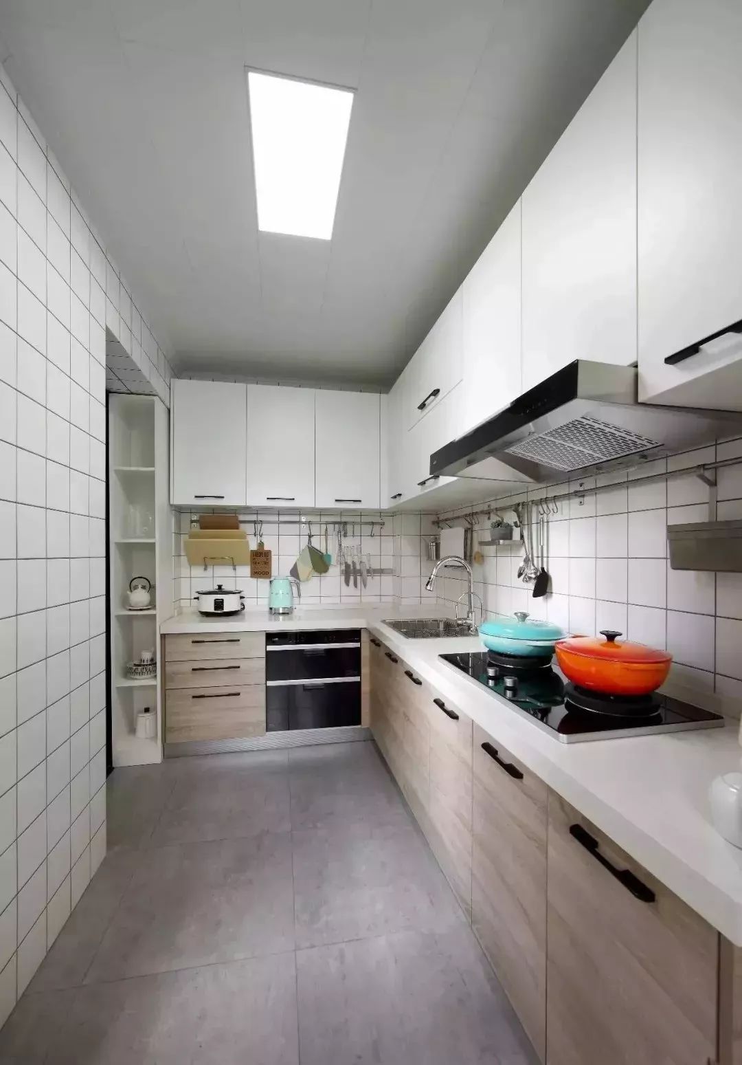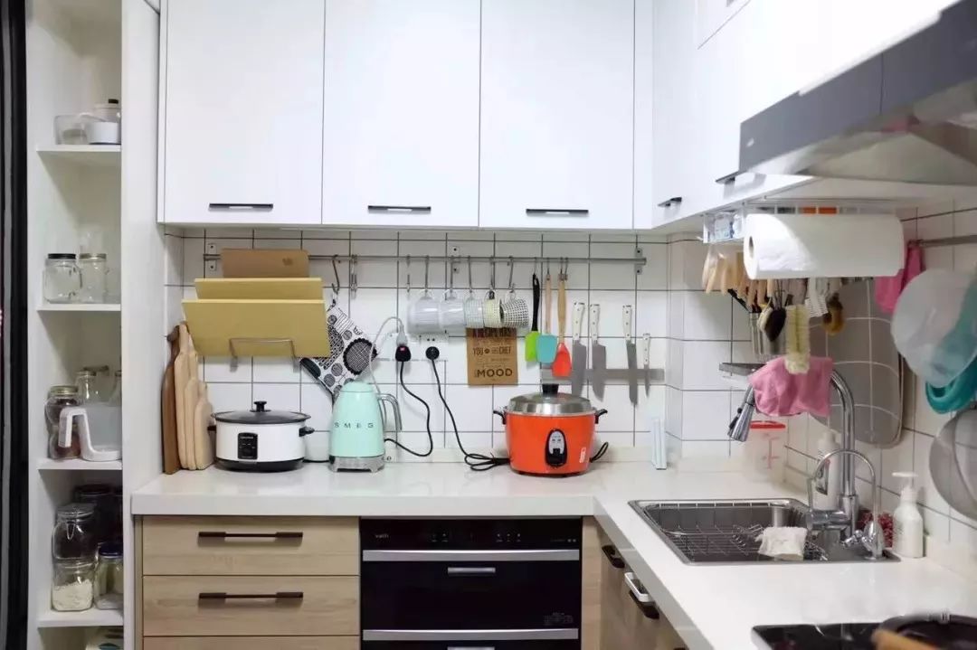 L型厨房布局,白色小方砖铺满了厨房的墙壁,整个空间看起来明亮清爽,一切厨房用具准备齐全,小到各种大小的水果刀;怕是落了什么,直到求婚的当天还在反复确认。