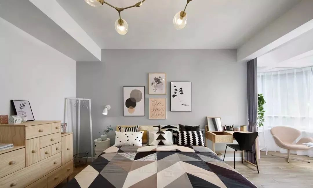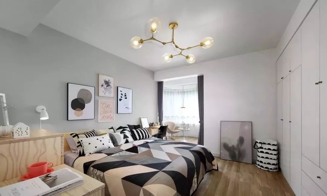 主卧铺设地板,脚感更加舒适,北欧风格的魔豆灯搭配再适合不过,几何主题空间,很有现代感。