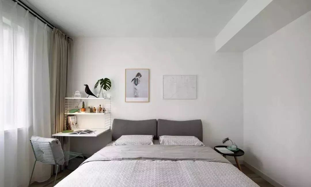 床头这套桌椅和挂画是装修公司送的,刚好放在这里,倒也不违和。