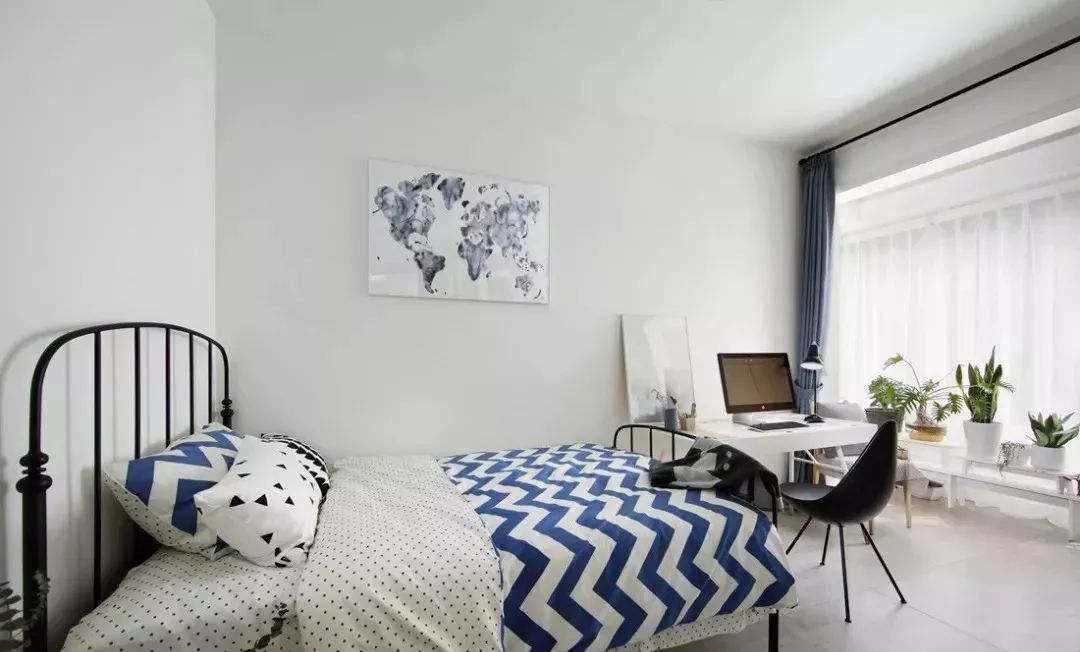 既是书房也是客房功能,作为客床选用的床架性价比高,搭配蓝白调的床上用品,颜值也是很高的!