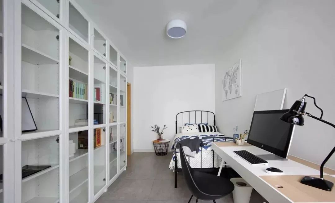 书房有一个超大的书柜,透明玻璃门能有效的隔绝灰尘,省去做清洁的时间,设计的时候都考虑得这么周到了,真的很有心。