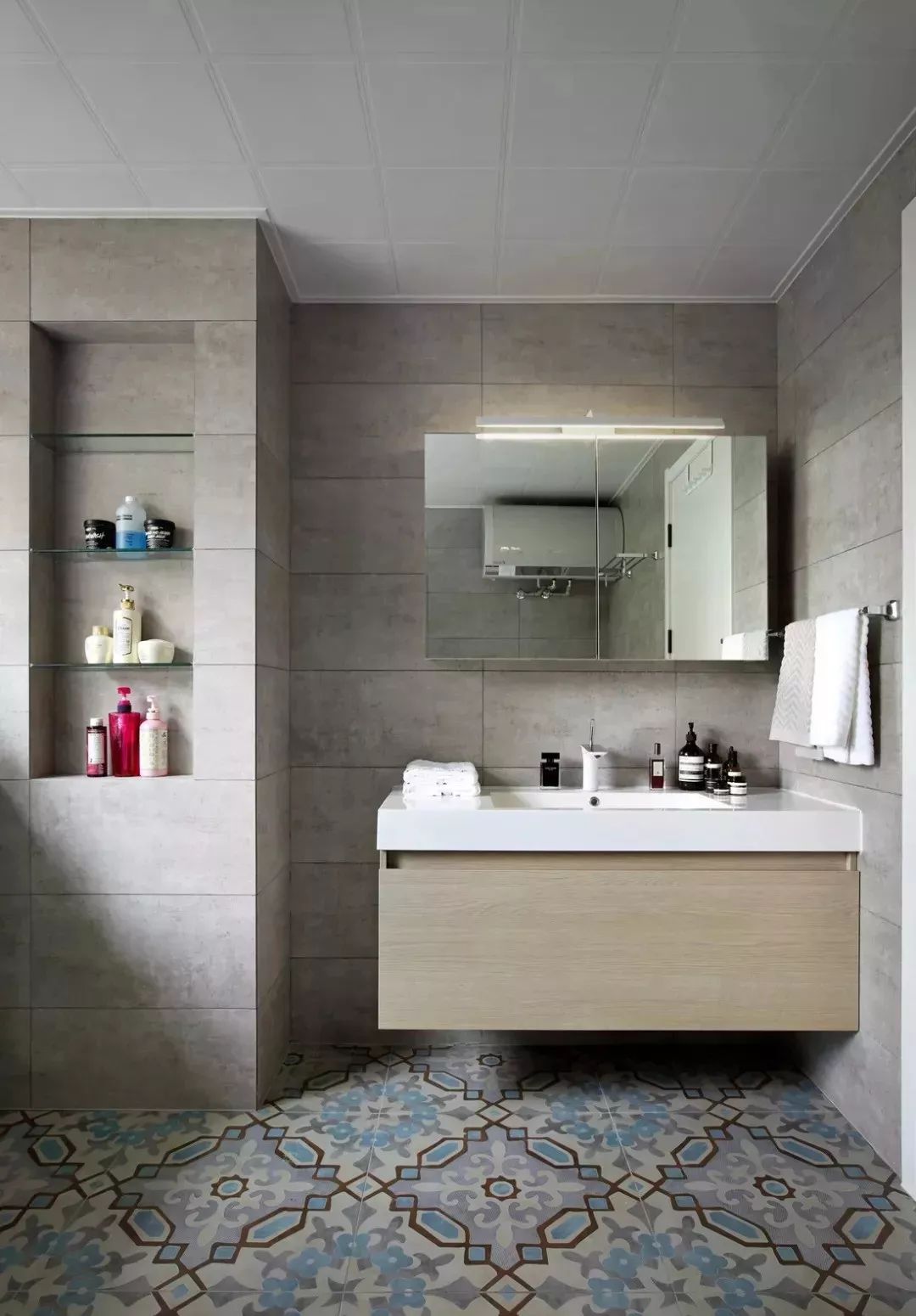 卫生间地选择了文艺的花砖,告别卫浴空间的无趣。镜柜做成收纳式,把洗漱用品都放在里面,保持台面整洁。