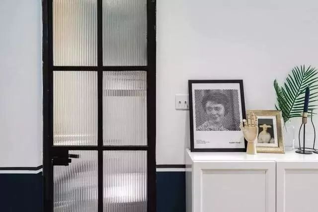 进门左手边是卫生间和玄关,卫生间的门是磨砂玻璃门,既能保证采光又不影响私密性,旁边是一个半高的鞋柜,柜面上放上相框、摆件和绿植,充满艺术的气息,起到很好的展示作用。