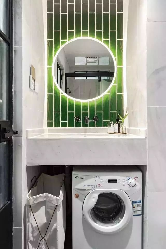 这是卫生间,把洗衣机嵌进了洗漱台下方,旁边多余的空间用来放纳篮,边边角角的空间也要充分利用起来。镜面背景墙贴工字造型墙砖,在绿色藏光的映衬下,显得格外漂亮有意境。
