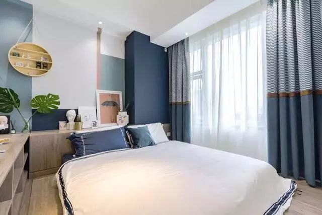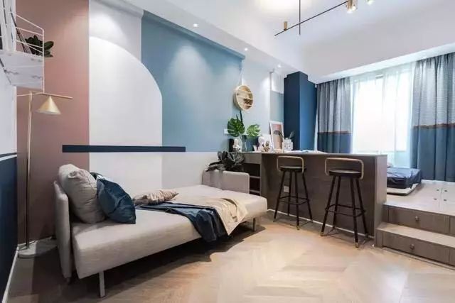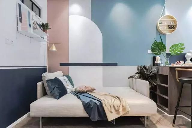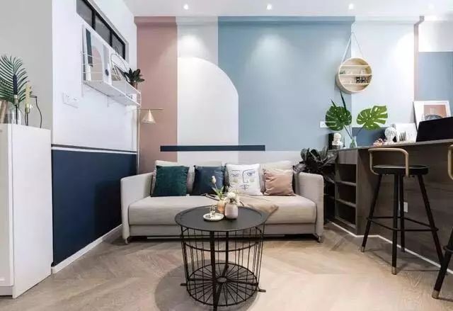 客厅是走的简约小清新路线,沙发墙由蓝色、粉色、白色拼接而成,看起来有一种清清爽爽的感觉,还特别显温馨,侧面的墙上装了置物架点缀了墙面空间,避免空白墙面的单调。沙发是采用折叠款式,有客人留宿的时候将沙发坐垫翻折过来就变成了一张小床,充当客卧功能,白天收起来又不占空间,对于小户型来讲特别实用。