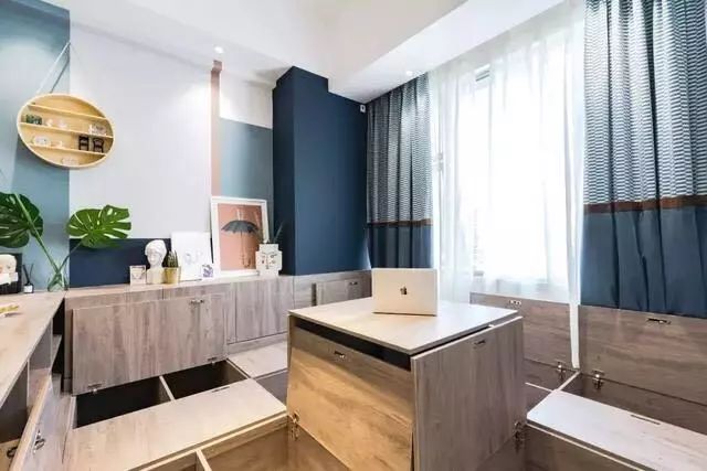 巧妙的地方来了,卧室的床除了可以睡觉以外,地台里还藏了很多格子空间,各种闲置物品还有过季的衣服和棉被都可以放进去,具有很好的收纳性。另外地台还带了升降台的功能,升起时,可以当工作台和茶室,朋友来了可以围坐在一起打打麻将或是喝喝茶,特别惬意吧,降下去以后就与地台融为一体,丝毫不占空间,达到一室多用的效果。
