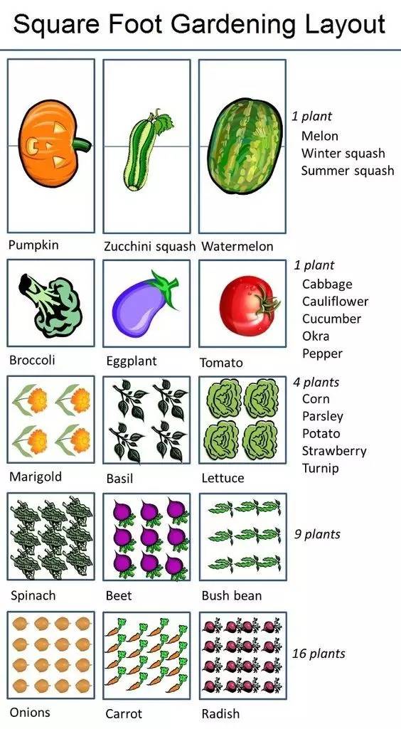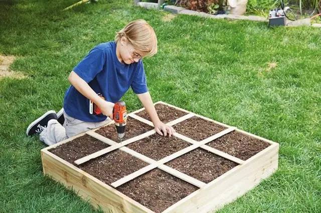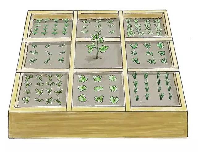 在种植箱上放上网格,每格约30厘米,网格使1米菜园更整洁,也能更好地组织植物。在每一个格子里种上一种蔬菜,根据植物大小和生长习性,每格可以种1,4,9,或16棵。