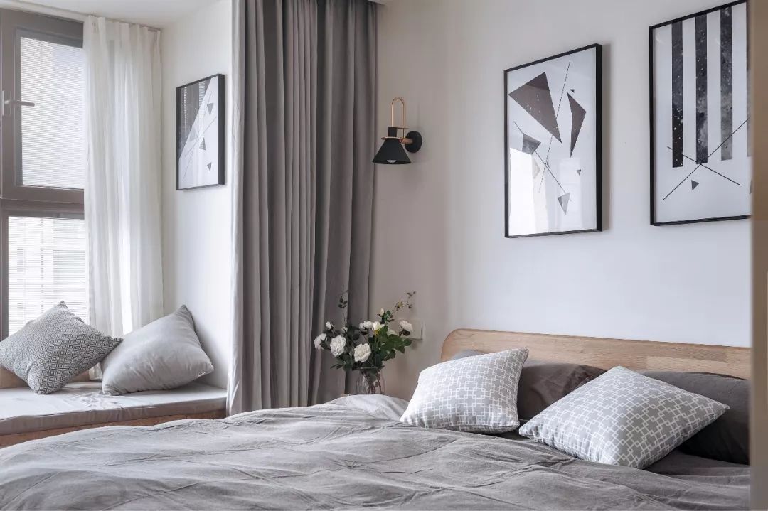 ▲灰色的床单与窗帘、飘窗垫,简约年轻的空间令人惬意自然。