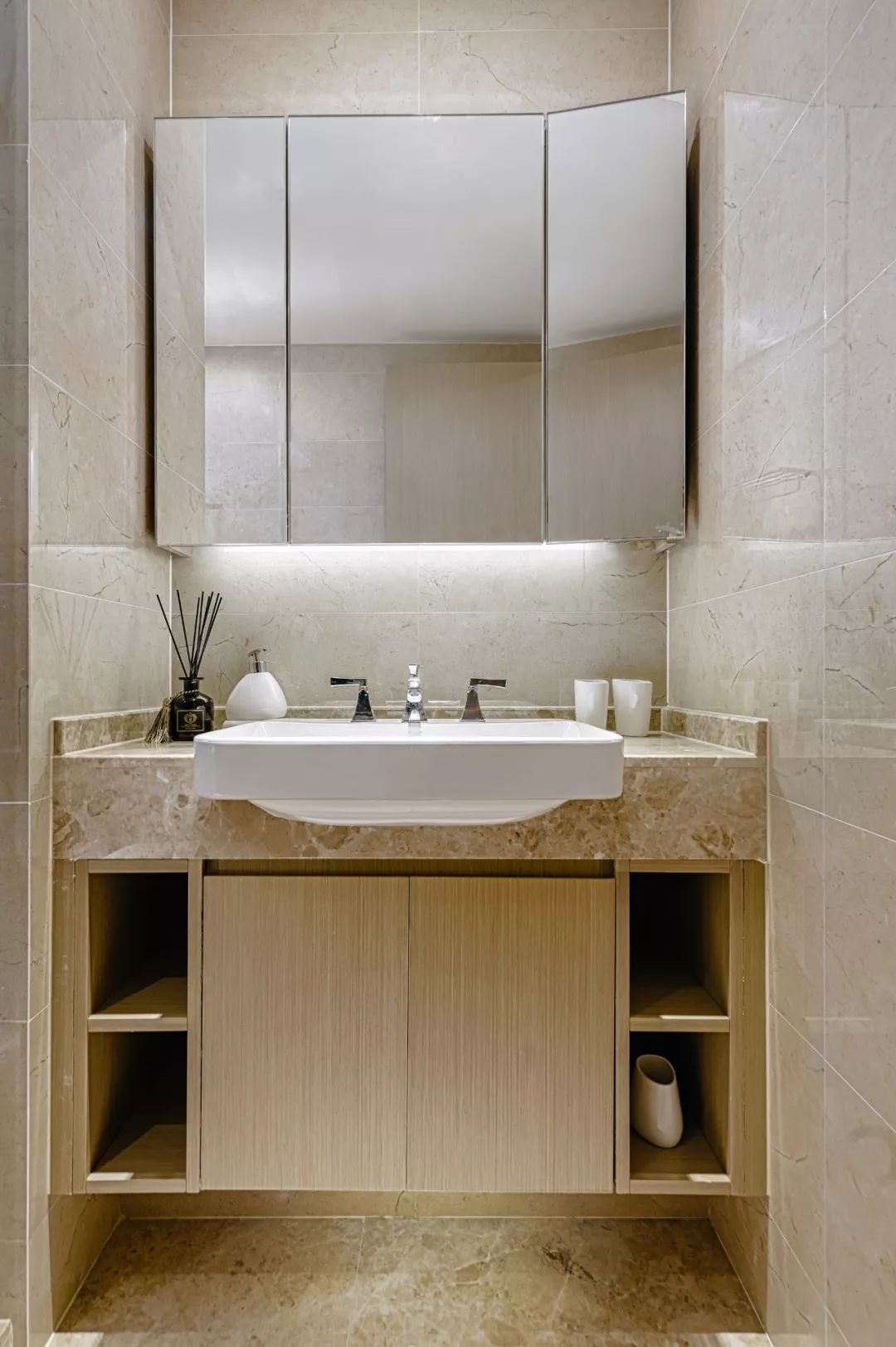 ▲卫生间洗手盆底部的收纳格,为洗浴用品提供了实用的存放位置。