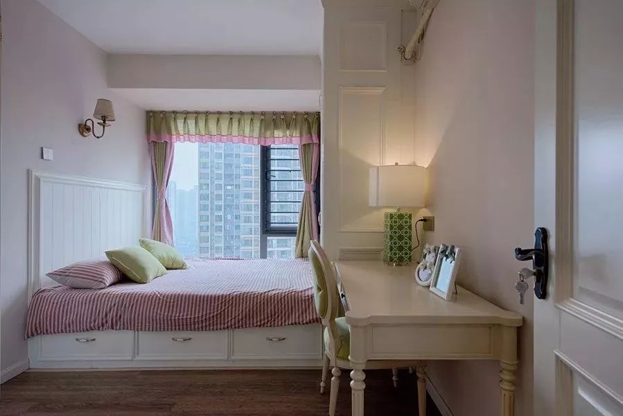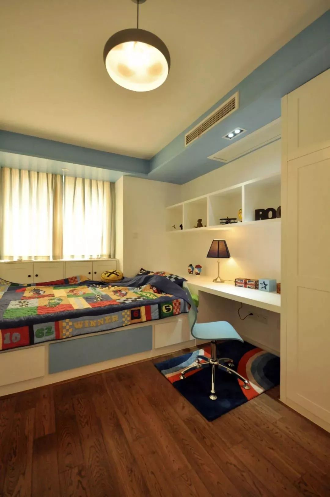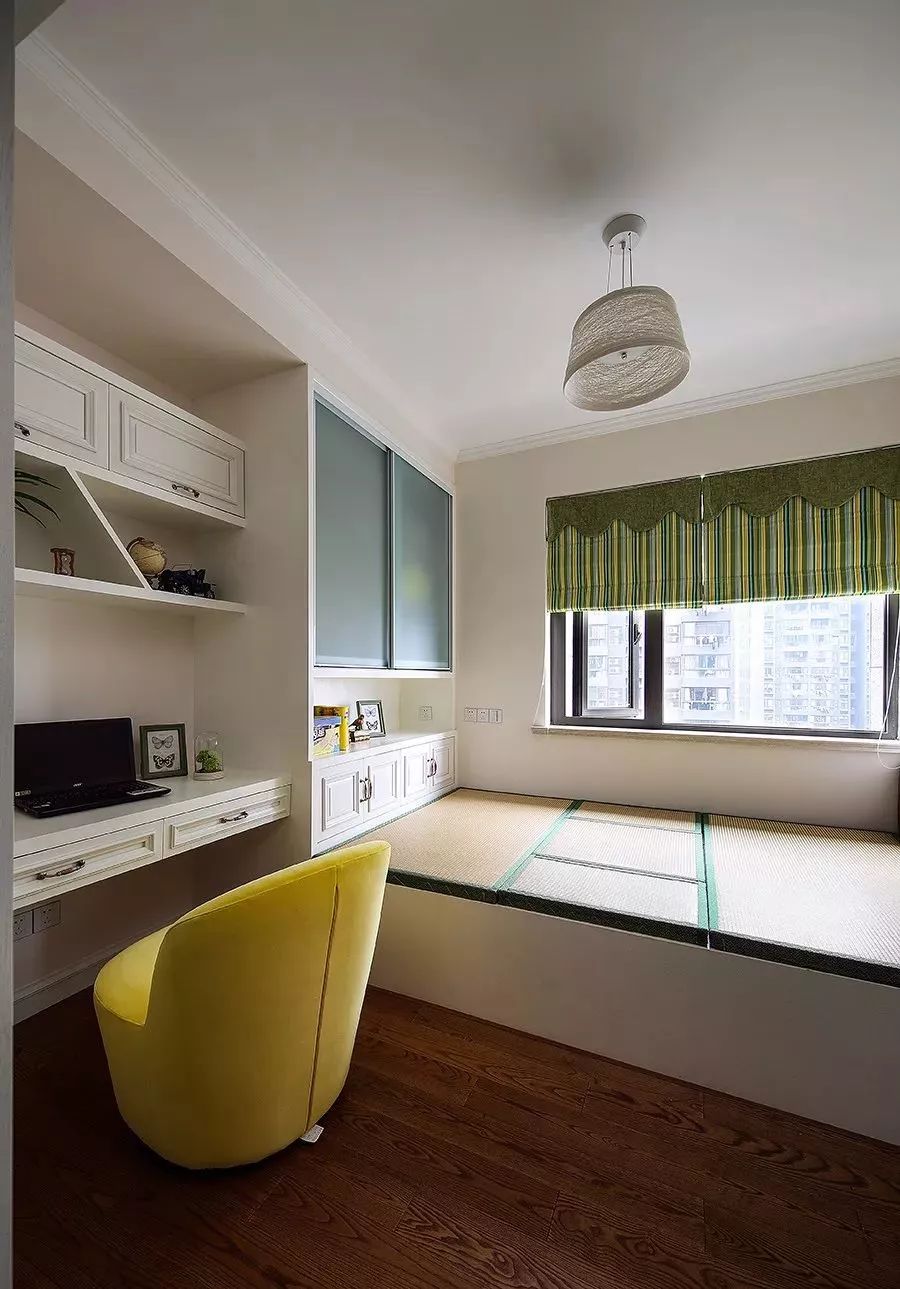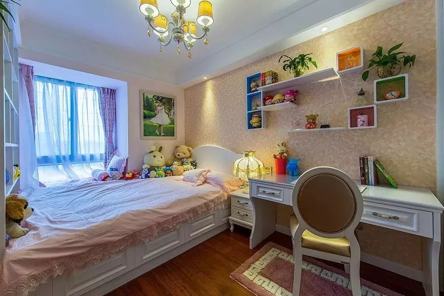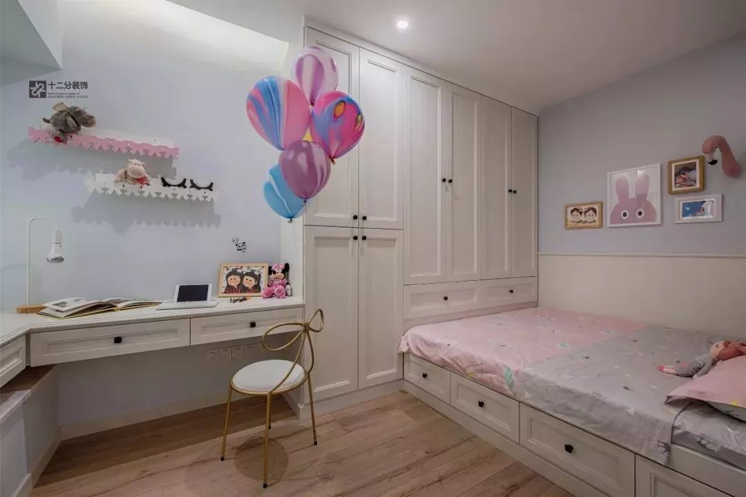 1、以童趣温馨的色调,榻榻米床、书桌与衣柜组合起来设计,空间利用得非常精致。